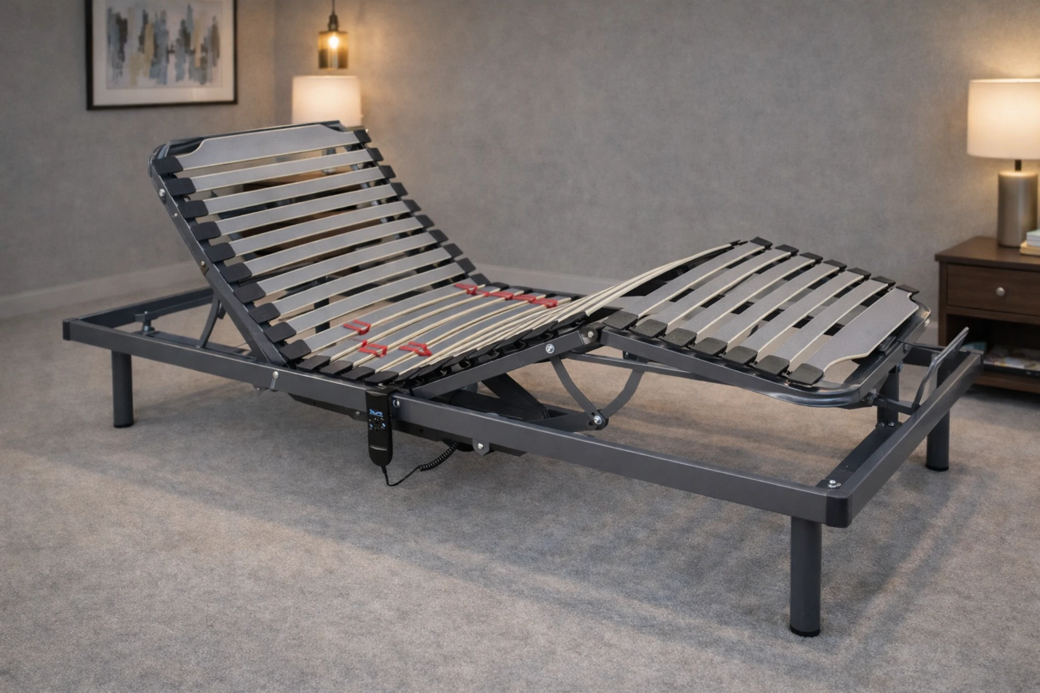 Una base motorizada utiliza uno o dos motores de empuje lineal anclados al bastidor metálico. A través de un mando a distancia (con cable o inalámbrico), los motores modifican los ángulos de los distintos planos, permitiéndote cambiar de postura sin realizar ningún esfuerzo físico.
