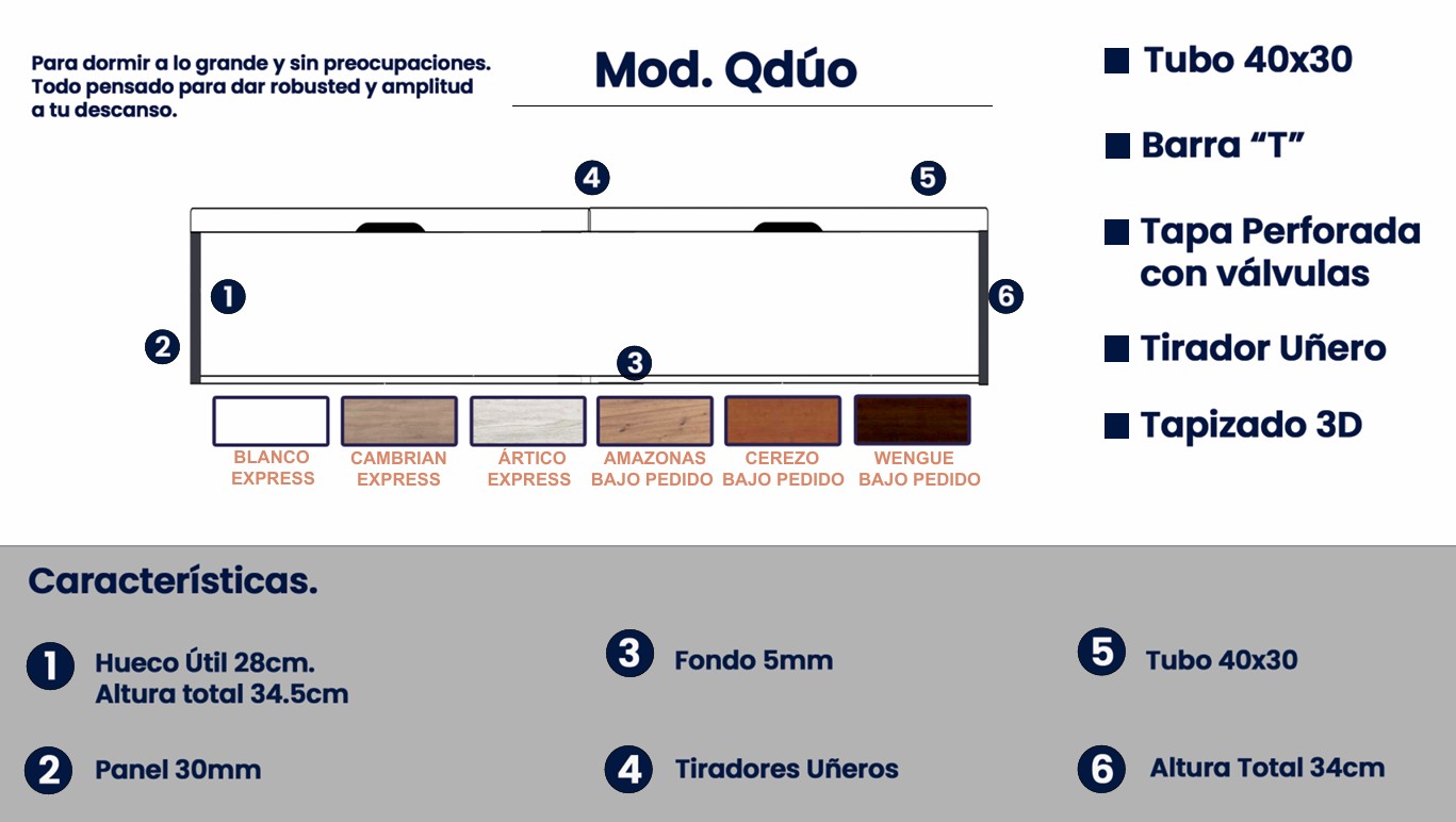 - Compatibilidad: Este modelo es compatible con todo tipo de colchones: VISCOELÁSTICOS, MUELLES y HR.
