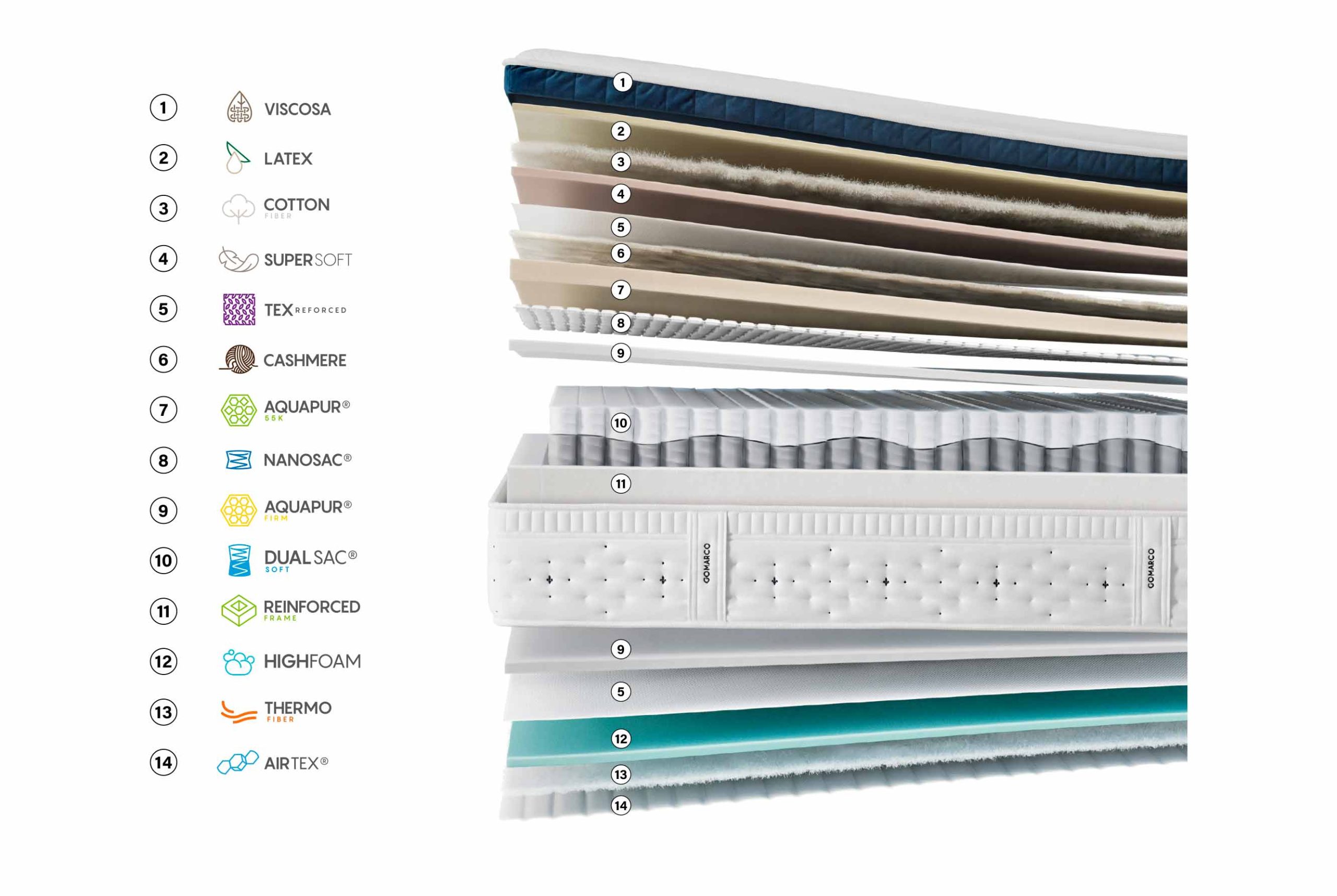 - Algodón (COTTON): Fibra natural, fresca y transpirable. Absorbe la humedad y regula la temperatura, manteniendo el **Colchón Level Top Soft de Gomarco** seco y equilibrado.