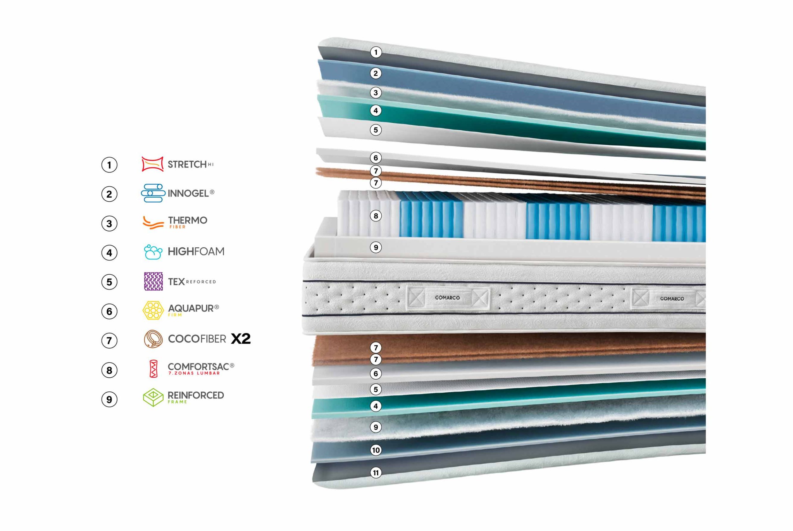 Gomarco ha integrado en este modelo componentes de vanguardia para garantizar durabilidad y confort. Destaca el uso de Cocofiber (fibra de coco natural) y capas de Aquapur Firm, que aportan una rigidez estructural difícil de encontrar en otros modelos. El perímetro está blindado con Reinforced Frame, un marco de HR que maximiza la superficie útil de descanso y previene deformaciones laterales.